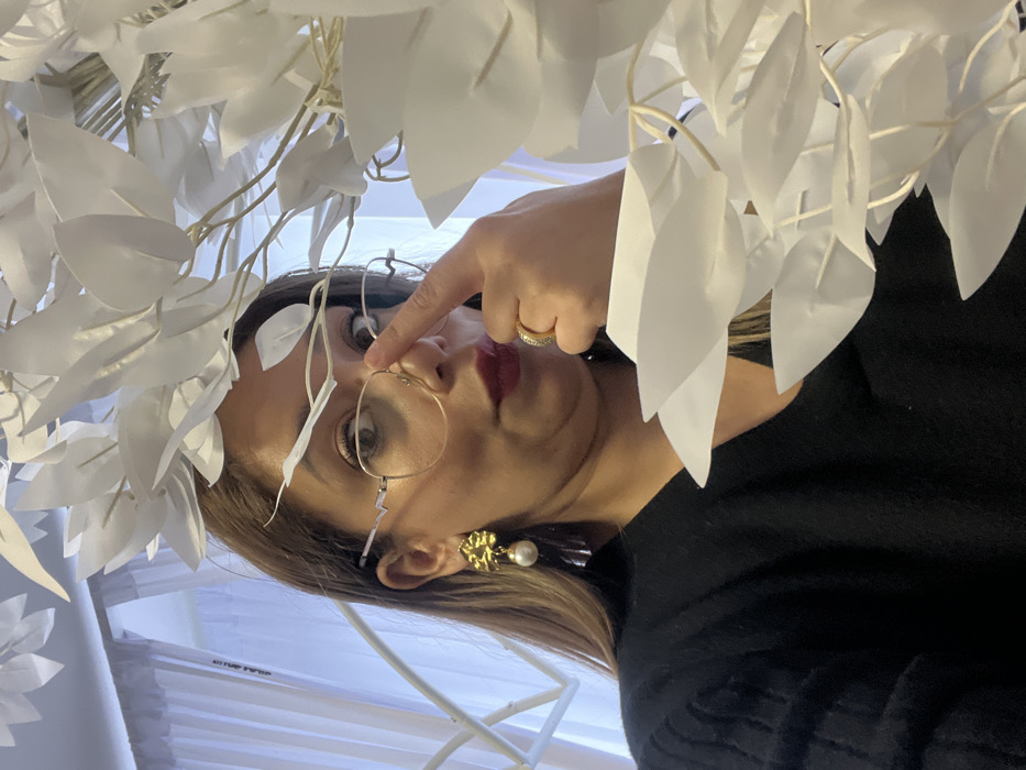 An adult female is photographed indoors, with the location identified as Mondeville, France. She has light brown hair and wears a black V-neck top. Her right index finger is pressed against the bridge of her gold-rimmed eyeglasses, which feature a zigzag design on the temple arms. Her expression shows pursed lips with dark red lipstick and a slight facial distortion. On her left ear, she wears a multi-component earring comprising a gold-toned abstract element, a large white spherical pearl, and a translucent, faceted drop. A gold-toned ring, possibly pavé-set, is visible on her right ring finger. The upper and foreground portions of the image are dominated by numerous white, artificial leaves with visible veining, suggesting a decorative structure or plant. A light-colored curtain is partially visible in the background.