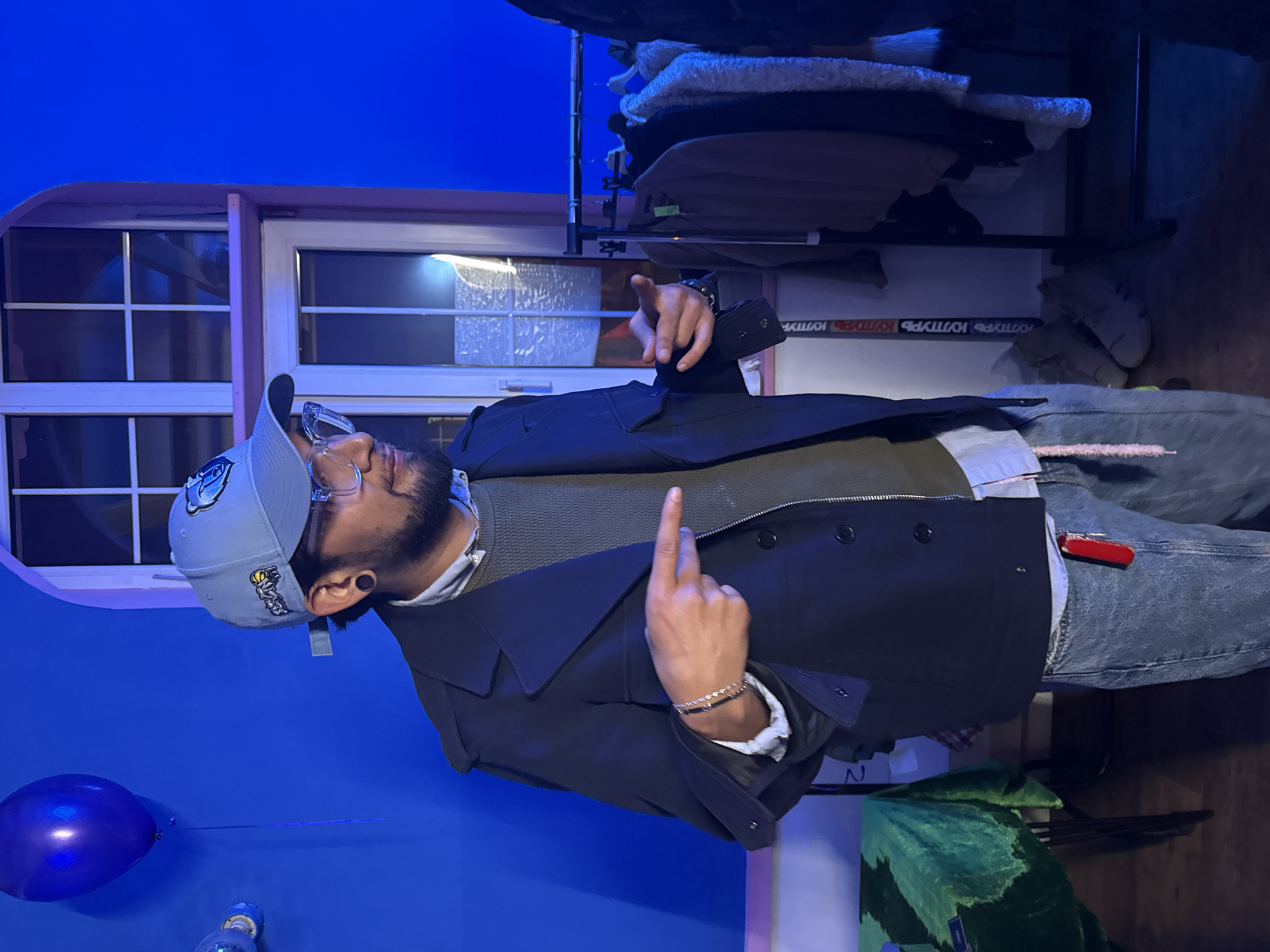 A bearded man in glasses and a baseball cap is indoors, wearing a coat and jeans, gesturing with one finger raised. He is in a blue-lit room. A balloon is on the wall. Behind him are a window and clothing rack. A red object is attached to his jeans. The location is not discernible as Sofia, Bulgaria from the details in the image.