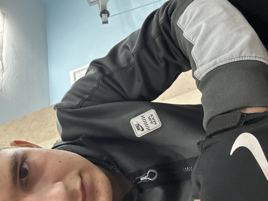 A close-up, angled indoor portrait features a male individual, partially visible from the nose down to the mid-torso, looking directly forward. He wears a dark grey or black full-zip athletic jacket with a white rectangular patch on the left chest displaying "NIKE" at the top and "AIR MAX" below. The jacket has contrasting lighter grey paneling on the lower sleeves. A black athletic glove with a white Nike swoosh logo on the back and a velcro wrist strap is visible on his left hand. The background consists of a light brown wall section behind his head, transitioning to a light blue wall in the upper right. A textured, possibly damaged, white ceiling is also visible. A white door frame is partially visible against the blue wall, along with a grey metallic fixture, possibly part of exercise equipment. The specific location in the city of Radomir, Bulgaria, cannot be determined from the visual information provided.