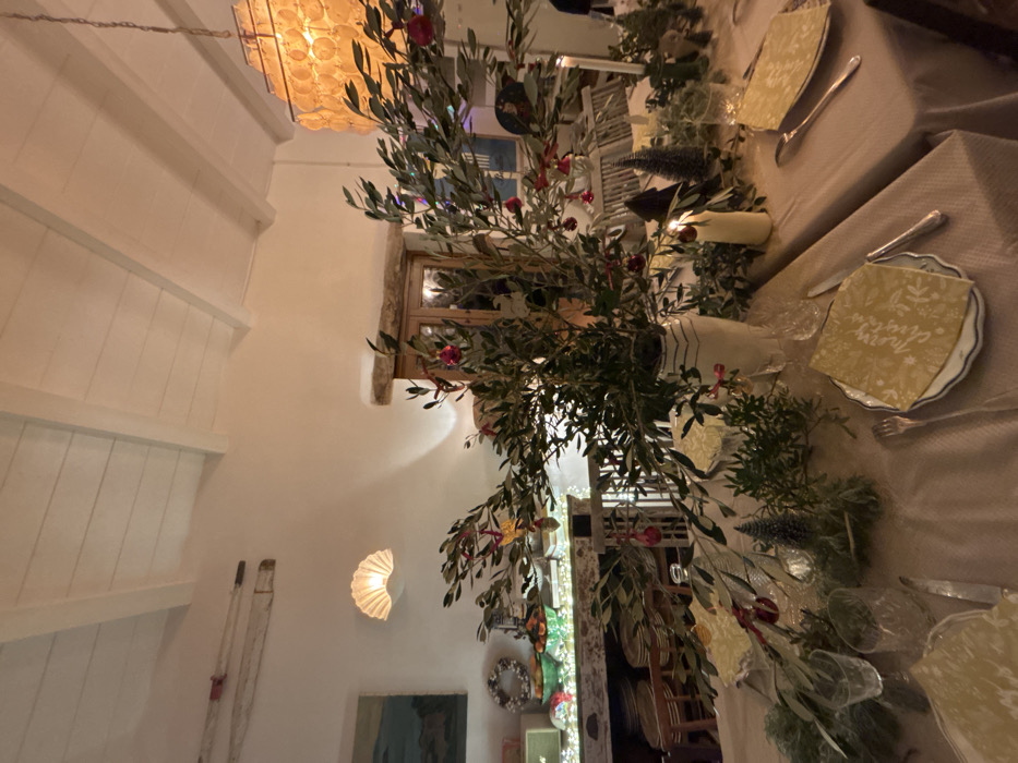 An intimate dining setting showcases a tastefully decorated table. A large vase brimming with leafy branches is centered, complemented by festive ornaments. Place settings feature plates adorned with decorative napkins and silverware. A softly glowing chandelier illuminates the scene, adding a warm ambiance to the interior space. Decorative wall sconces and paintings accent the walls, contributing to the overall aesthetic.