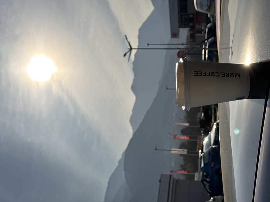 A white disposable coffee cup, branded "MORE.COFFEE" vertically, rests on a dark, reflective surface, likely a vehicle's exterior, in the foreground. The cup's lid and the surface below reflect strong sunlight. The midground features a commercial area with parked vehicles, including a blue sedan, and streetlights. On the left, a building with white and red architectural elements is visible, along with multiple red flags displaying white text. To the right, another commercial building, possibly a gas station, is discernible. The background is dominated by a multi-layered mountain range extending across the horizon under a hazy, light blue sky with scattered clouds. A bright, intense sun, positioned in the upper right, causes significant glare and lens flare. The scene is located in the city of Dub, Montenegro.