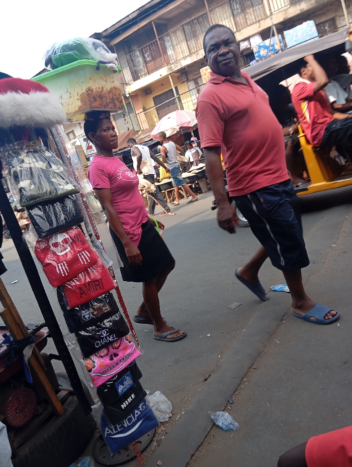A vibrant street scene shows a woman carrying a large container on her head