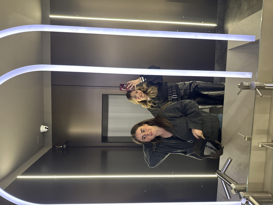 This image depicts a mirror selfie taken by two females in a modern, well-lit restroom or washroom located in Yerevan, Armenia