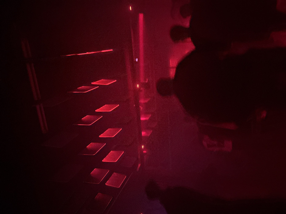 A dark image saturated with red light reveals a computer case interior. Rows of illuminated rectangular components line the side, reflecting on the glass. A vertical strip with red LEDs runs alongside. The right side of the image features a blurry silhouette of a person, also bathed in the red hue. The reflection of the person is dimly seen on the glass. The low light and red cast obscures details.