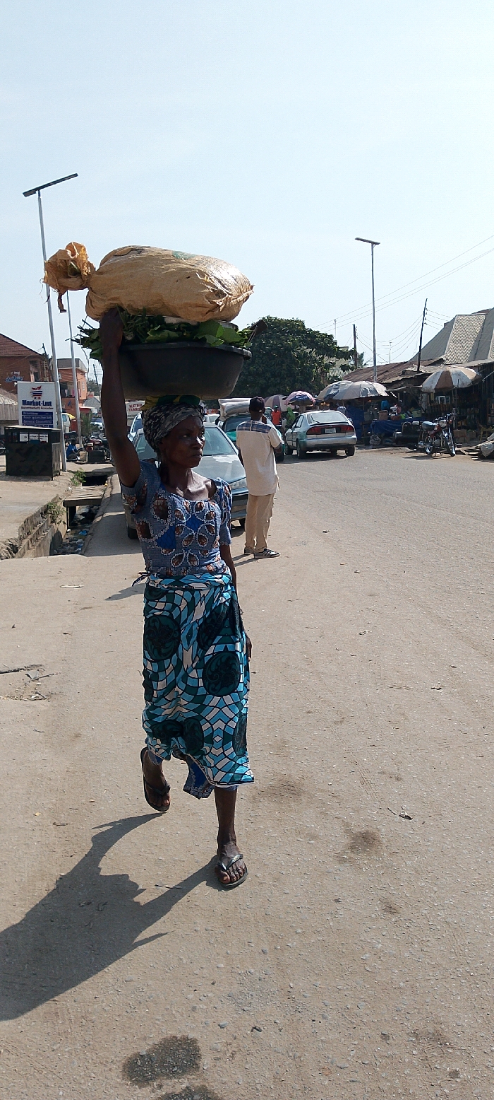 An adult woman is depicted walking on a paved road in Kubwa, Nigeria, under a clear sky