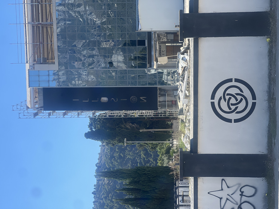 The image displays an outdoor scene in Bjeliši, Montenegro, under a clear blue sky. In the foreground, a white wall with black vertical accents runs horizontally. This wall features black spray-painted graffiti including a star outline on the left and a circular black symbol resembling a stylized trefoil knot within a target design on the right. Faint brown text, "MUSTARD," is also visible on the wall. Behind the wall, a substantial pile of construction debris, consisting of broken concrete, metal, and other fragments, is present. The central subject is a multi-story building, appearing to be in a state of construction, renovation, or partial demolition. Its left-facing facade is a dark, possibly black, vertical panel displaying the word "ILLUSION" in light, vertically oriented letters. Metal scaffolding is erected along the left side of this panel. The right section of the building features a glass facade with a grid pattern, exhibiting reflections and at least one visibly broken or missing window panel. Below this glass section, a small, makeshift sign made of light-colored material reads "NTERTAINMENT ET." To the left of the building, in the background, several tall, slender evergreen trees and two streetlights are visible. Beyond these, a dense, green-forested hillside or mountain range occupies the horizon. No individuals or vehicles are present in the immediate scene.
