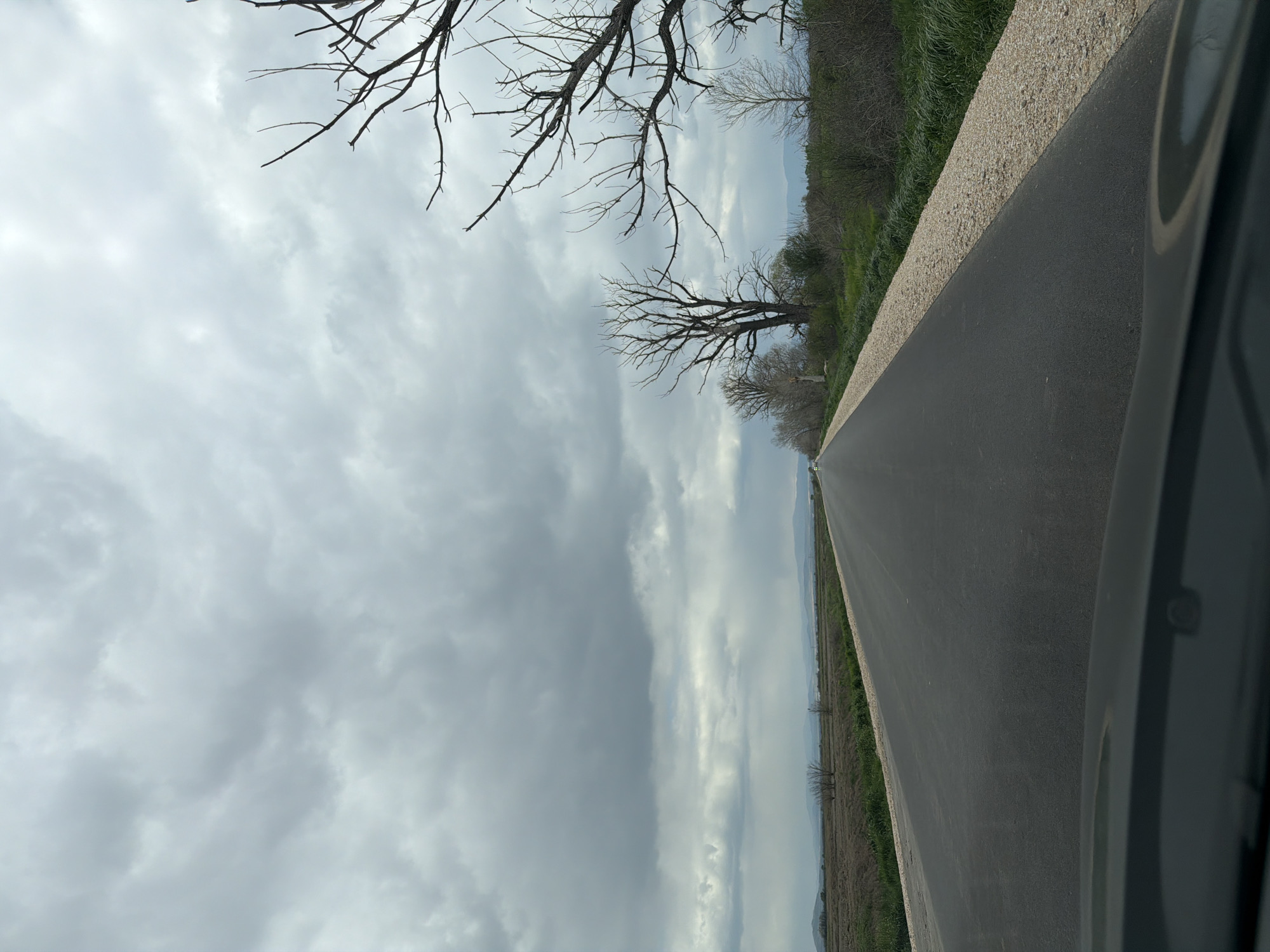 A roadside view, likely taken from a moving vehicle, presents a long, straight asphalt road receding into the distance