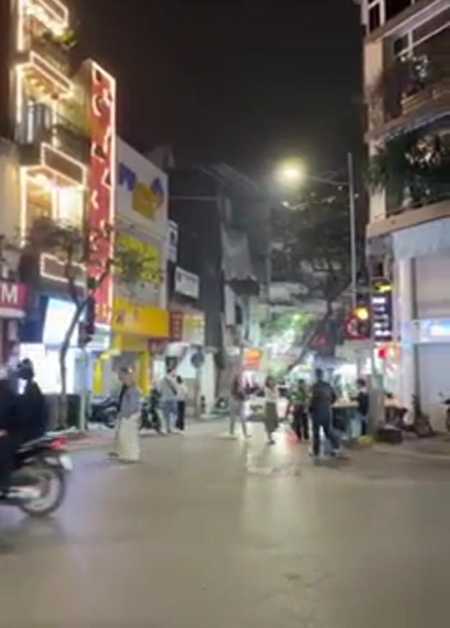 The video depicts a nighttime street scene in what appears to be an urban area. The street is bustling with activity; pedestrians are walking along the sidewalks and crossing the street, and several motorbikes are navigating through traffic. Buildings line the street, some adorned with bright lights and signs. An ATM is visible on the ground floor of one of the buildings. The street itself seems somewhat wet, reflecting the artificial lights from the buildings and streetlamps. A tree with bare branches adds a touch of natural element to the otherwise urban setting.