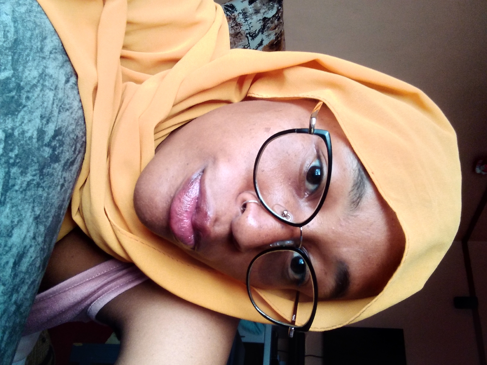 A close-up, angled selfie shows a person with dark skin and black, round glasses wearing a mustard yellow headscarf