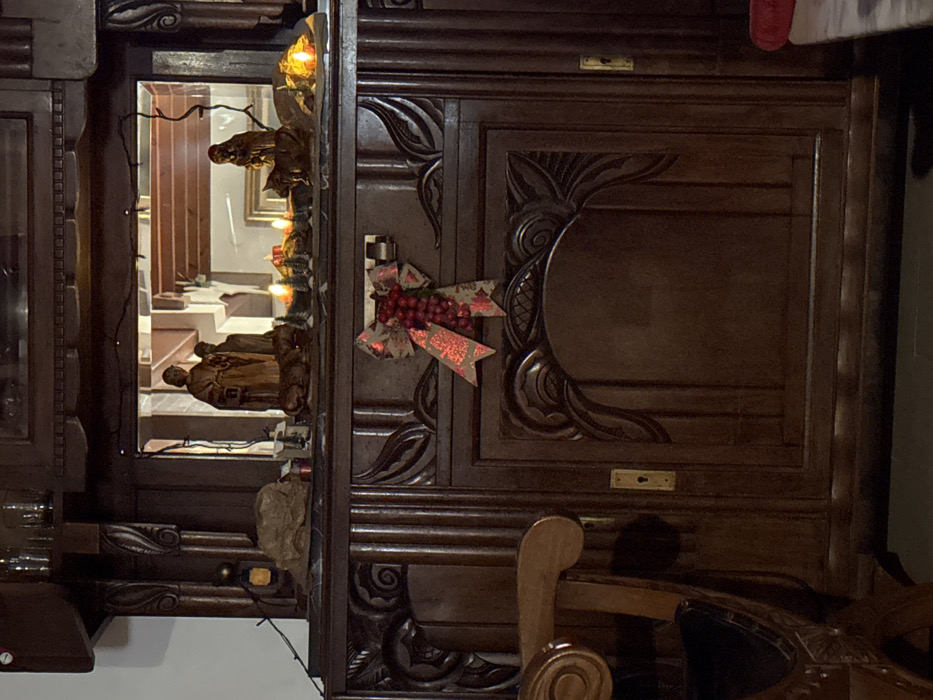 An ornate dark wooden cabinet features intricate carvings. A ribbon and berry decoration adorns the front. A section of the cabinet is open, revealing a glimpse into a room with religious figurines, stairs, and framed artwork. String lights are also present, adding a subtle glow to the interior. The scene appears to be indoors.