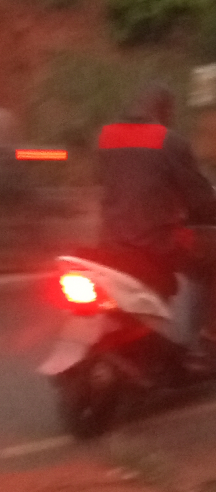 A blurred image shows the rear of a motorbike with two riders. The taillight is brightly illuminated. Red rectangles obscure areas on both riders' backs, potentially concealing identifying marks. The setting appears to be outdoors during twilight or nighttime, with foliage visible in the background. The road is dimly lit.
