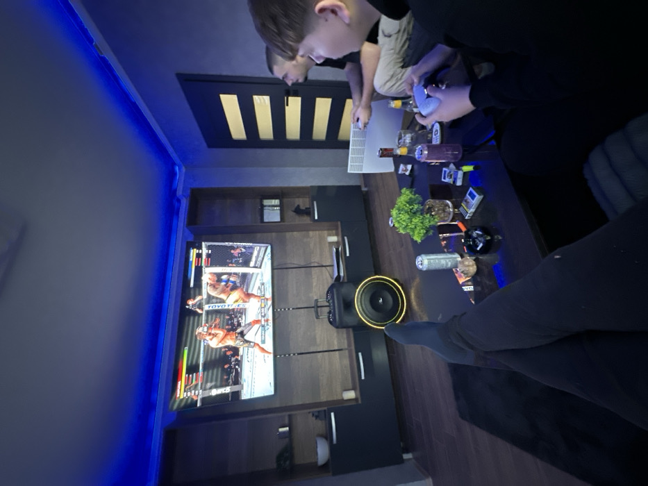 The image depicts an interior scene within a residence in Byala, Bulgaria, characterized by dim ambient lighting enhanced by blue LED strip lights tracing the ceiling perimeter. Three males are present. In the foreground, the lower legs and feet of a person are visible, crossed at the ankles, clad in dark pants and blue socks, suggesting a relaxed posture, likely from a sofa or chair. Two other males are seated towards the right of the frame, partially visible from the side and rear, both holding game controllers and appearing focused on a large flat-screen television mounted centrally on a wall unit. The television displays a video game featuring two male fighters in a mixed martial arts (MMA) octagon cage, with game interface elements such as health bars visible at the top. Below the TV, a dark wood and black entertainment unit with shelving and cabinets is positioned. A prominent black portable speaker or subwoofer with an illuminated yellow/orange ring is situated on the floor in front of this unit. Two tall, slender, dark stands flank the speaker. In the mid-ground, a dark, rectangular coffee table is laden with various items: several aluminum beverage cans (some red, some silver), a glass, a beer bottle, a small potted plant, an ashtray containing cigarette butts, multiple cigarette packs (at least one identifiable as Marlboro), lighters, a mobile phone, and a remote control. The room features dark walls and a dark wooden floor. To the right, a white panel heater/radiator stands on the floor against the wall, adjacent to a dark door with five horizontal light-colored panels. The overall environment suggests a contemporary living space configured for gaming and casual socializing.