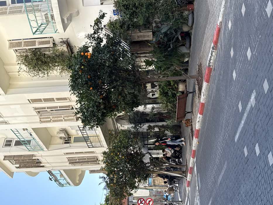 The image depicts a daytime street scene in Tel-Aviv, Israel, focusing on a multi-story building and its adjacent sidewalk