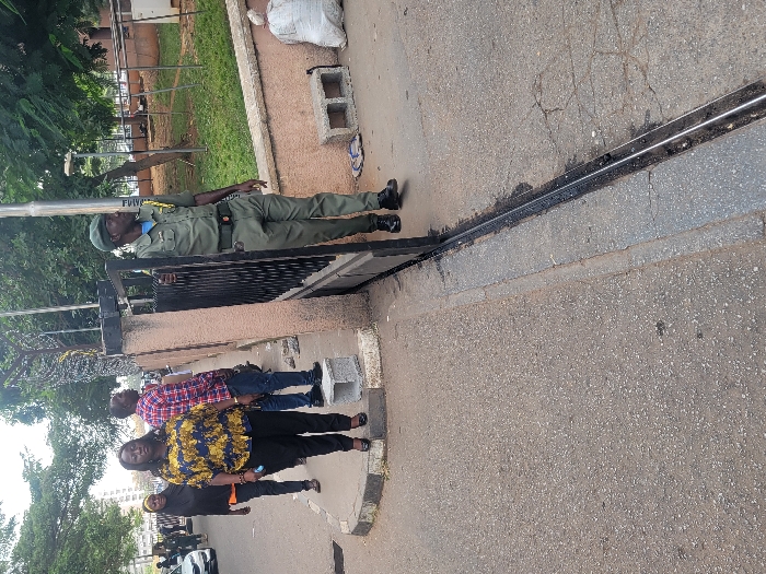 This image depicts an outdoor scene at the guarded entrance of a facility, likely a government building, institution, or private establishment, situated along an asphalt road in Abuja, Nigeria