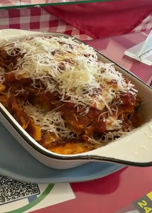 rectangular baking dish filled with food, likely a pasta bake or lasagna, topped with shredded cheese. The dish is white with a black rim and sits on a blue plate. A red and white checkered cloth is visible in the background, suggesting a restaurant setting. A folded card is also visible next to the dish.