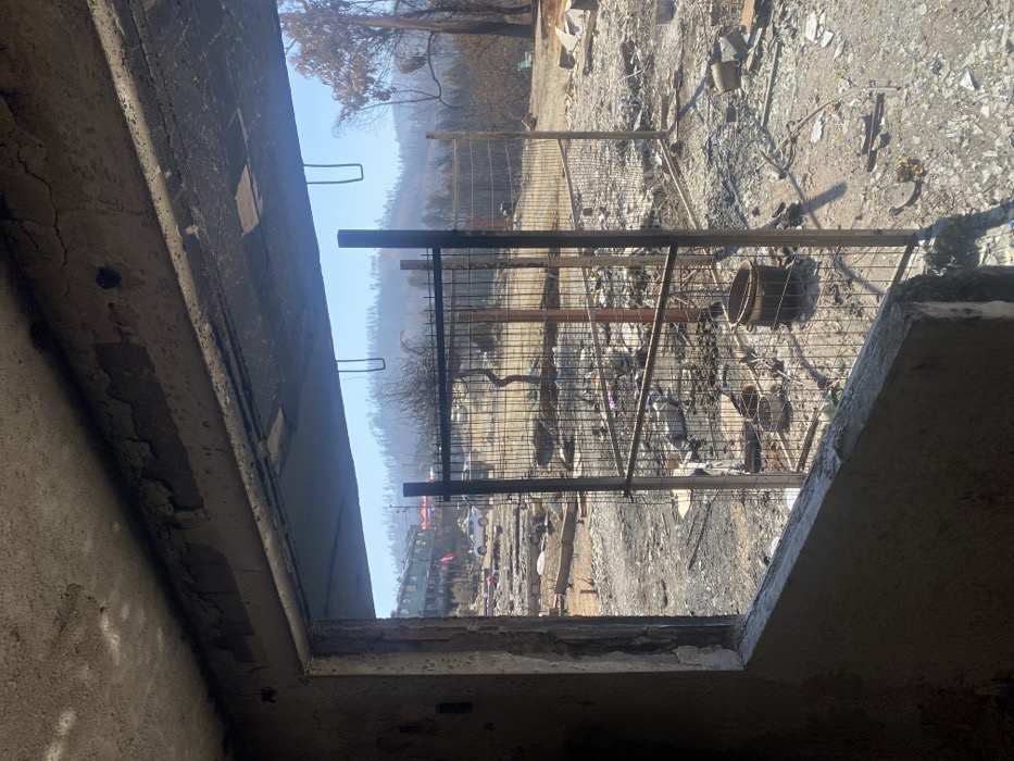 view from inside a concrete building with a rectangular window frame. Outside, the scene depicts devastation, likely from a fire, with charred remains and debris covering the ground. A partially standing metal fence runs through the landscape. In the distance, the hills are visible through a haze, indicating widespread environmental impact. The overall tone of the image is one of destruction and loss.