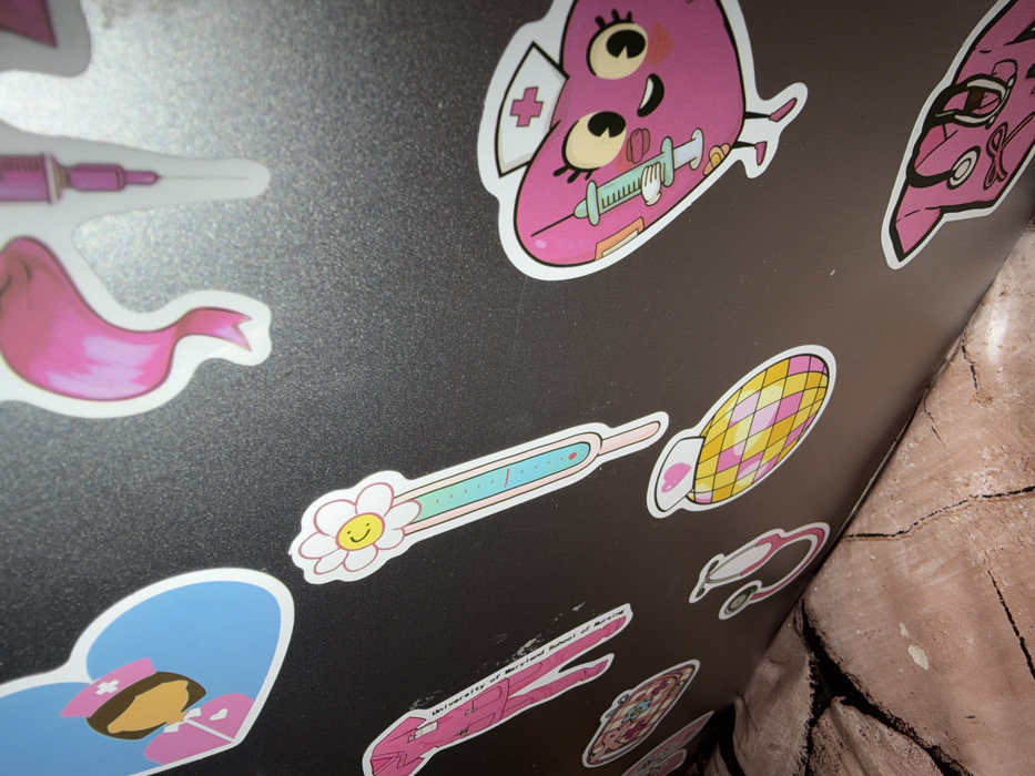 - "The image displays a dark, possibly metallic surface, likely a laptop lid, heavily adorned with numerous cartoon-style medical and nursing-themed stickers, located in Fez, Morocco" by FM-vkvYF2, licensed under CC BY 4.0