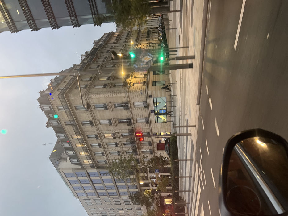 The image depicts an urban street scene in Neuilly-sur-Seine, France, observed from within a vehicle at an elevated perspective. The scene is dominated by architectural structures under an overcast sky, suggesting twilight or early morning. To the left, a modern, multi-story building with a light-colored facade and numerous large, rectangular windows is visible. Adjacent to this, and forming a street corner, is a classic Haussmannian-style building constructed of light beige stone. This building features multiple stories with ornate balconies, uniformly spaced windows, and a mansard roof with dormer windows. Its ground floor houses a BCL bank branch with illuminated interior and clear glass frontage. Further to the right, a contemporary building with a dark, reflective glass facade is partially visible. In the foreground, a multi-lane asphalt road with white dashed lane markings and a delineated pedestrian crossing is present. Numerous metal bollards line the edge of the road, separating it from the sidewalk and planted medians containing small trees and shrubs. Essential objects include: * A red pedestrian traffic signal on the left, displaying a red hand symbol. * A green vehicle traffic signal on the right, indicating active traffic flow. * Multiple streetlights, some actively illuminating the scene. * A dark-colored car, possibly red or black, parked near a red door entrance of the Haussmannian building. * Several motorcycles or scooters are parked in a line along the sidewalk on the far right. * The side mirror of the viewer's vehicle is visible in the bottom-left corner, reflecting internal and external light sources. Regarding people: * Two individuals are walking on the sidewalk in front of the BCL bank, moving away from the viewer towards the right side of the frame. Their forms are indistinct. * Another individual is partially visible near the entrance of the modern building on the far left. The environment is an active urban thoroughfare, characterized by a mix of historical and modern architecture, pedestrian and vehicular infrastructure, and artificial lighting complementing the natural ambient light.