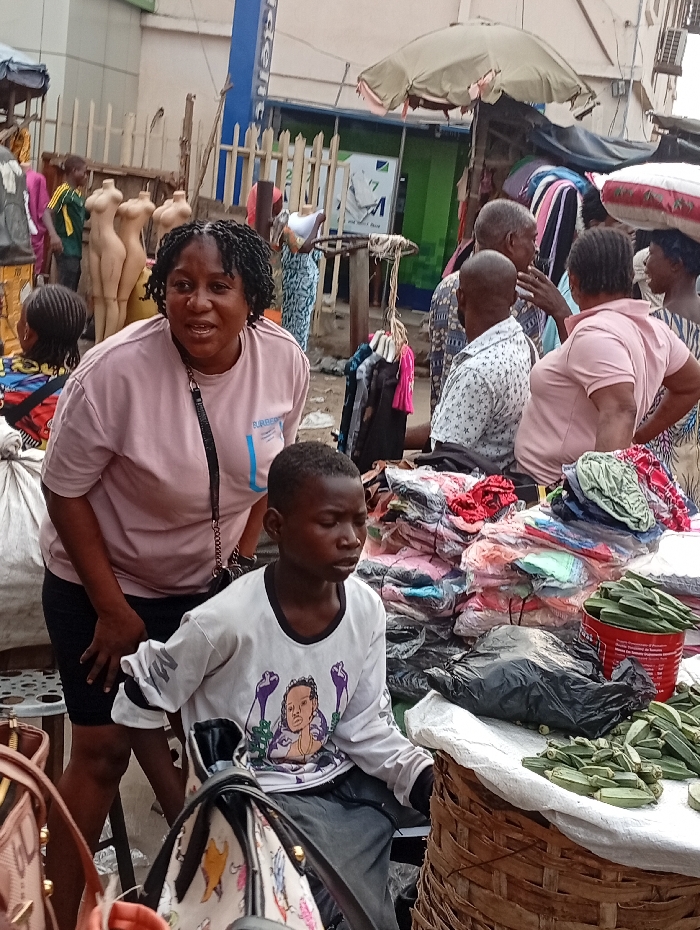 In a bustling outdoor market, a woman in a pink top stands beside a young boy in a graphic tee. He sits near a display of okra on a woven table. Piles of colorful fabrics and garments are stacked behind them. Various people, including some carrying goods on their heads, mingle in the background. Mannequins and vendor stalls add to the busy street scene. The lighting indicates a daytime setting.