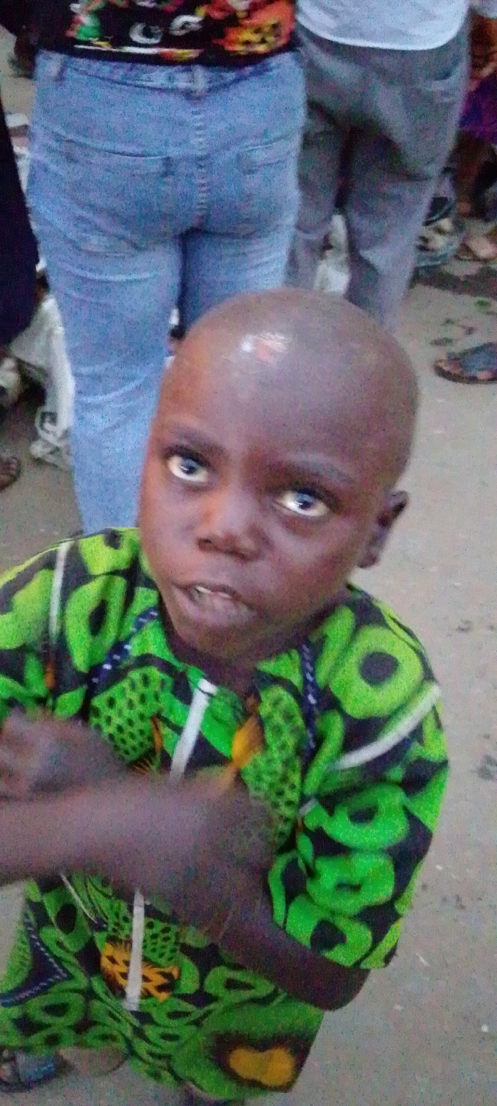 The image displays a young child of African descent, appearing male, positioned centrally and looking directly forward