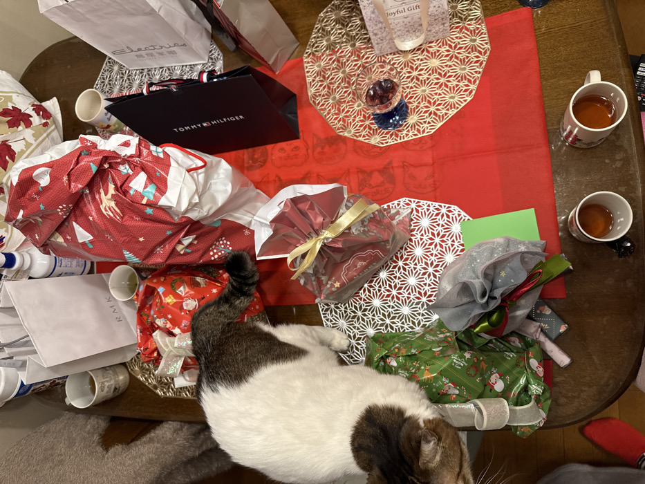 The image displays an overhead view of a cluttered wooden table within a private residence in Kawasaki, Japan, laden with items associated with gift-giving. A domestic bicolored cat, primarily white with brown patches and a striped tail, is positioned on the left side of the table, with its head near a green-patterned wrapped gift. The table features numerous wrapped presents in various papers, including red with festive motifs and green with holiday designs. Several shopping bags are present, notably a white RMK branded bag and a black Tommy Hilfiger bag. A clear plastic gift box containing a red-wrapped item secured with a gold ribbon is visible. Beverages include four mugs containing a dark liquid, possibly tea or coffee, and one clear glass holding a dark red liquid, positioned on decorative placemats. A red fabric runner partially covers the table. Additional objects include a white spray bottle, a roll of white ribbon, a green card, and a partially visible television remote control. A human leg, clad in a red sock, is visible in the lower left portion of the frame, indicating a person is seated at the table. The arrangement suggests an ongoing or recently completed gift-wrapping session.