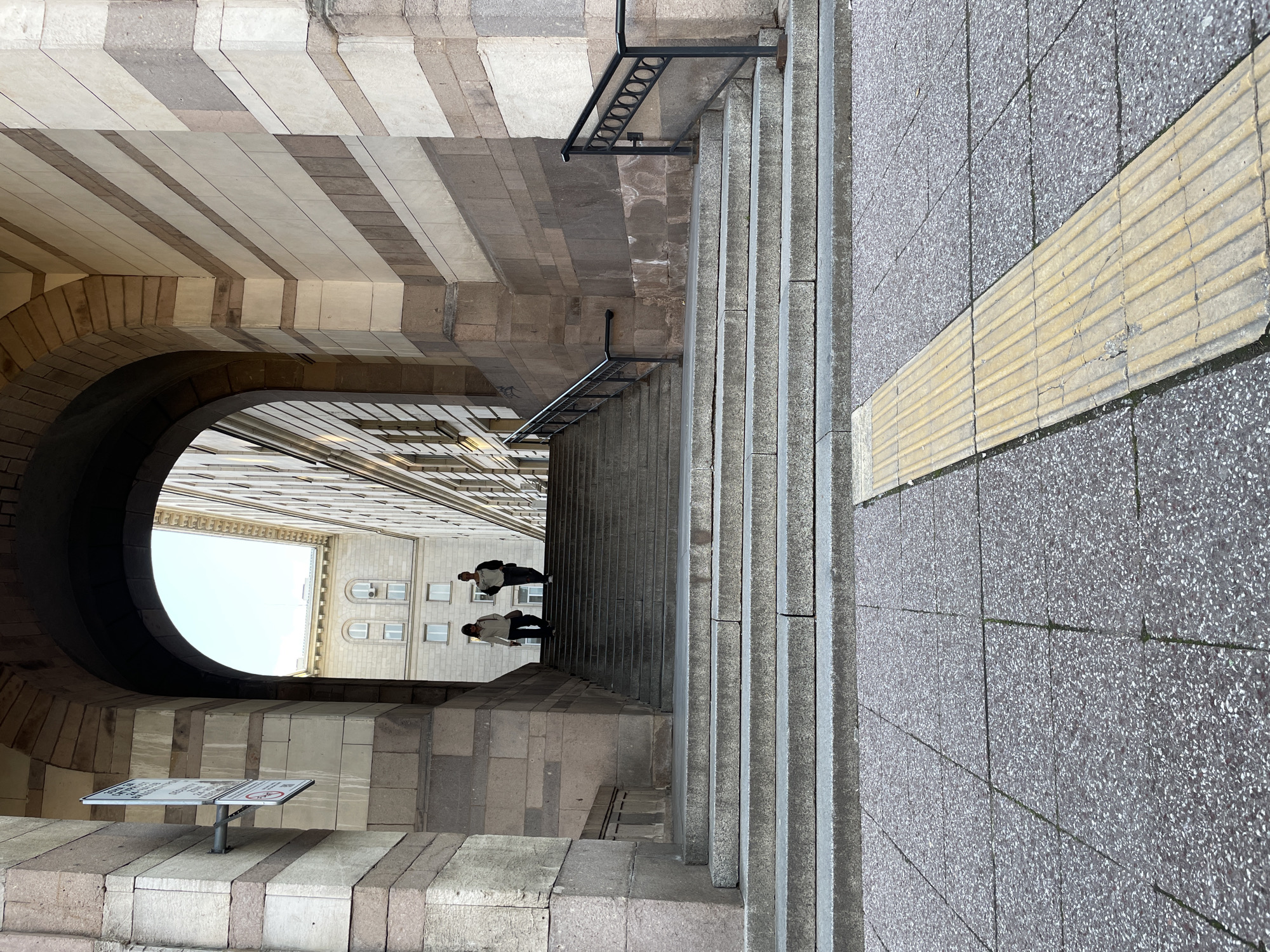 n outdoor architectural scene, featuring a stone archway and a set of stairs. The location is likely in the city of Sofia, Bulgaria, given the architectural style reminiscent of buildings in that area. Two people stand in the archway, appearing small relative to the architecture. The stairs are made of gray stone and have a handrail. The pavement next to the stairs is tiled and features a yellow tactile paving surface, presumably for visually impaired pedestrians. The archway reveals a view of a building with windows. The overall perspective is from a low angle, looking upwards through the arch.