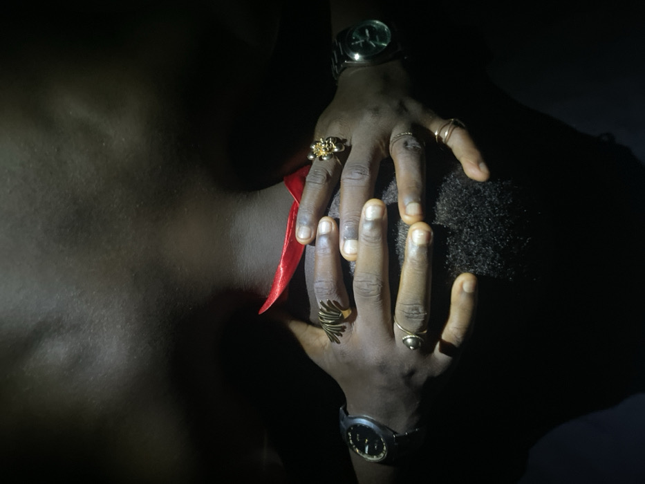 The image depicts a close-up of skin and hands in a dimly lit setting. The hands, adorned with rings and watches, gently cradle an afro hairstyle. A vibrant red ribbon is positioned between the hands and skin. The lighting creates strong contrasts, highlighting the textures of skin, hair, and jewelry. The overall composition evokes a sense of intimacy and care.