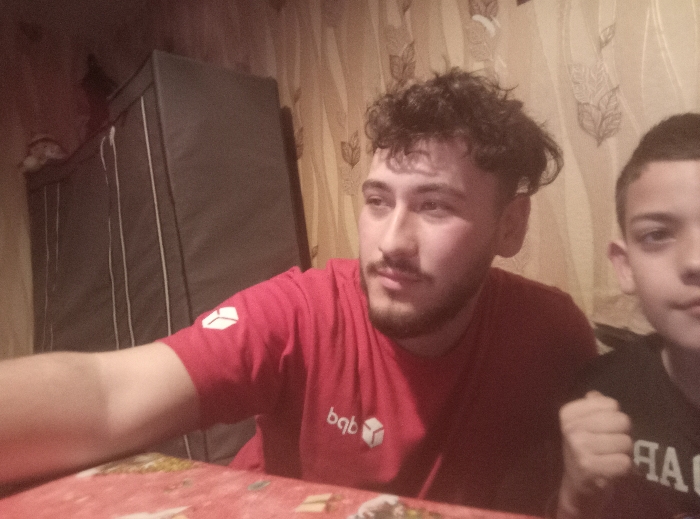 The image depicts two males in an indoor setting. A young adult male, characterized by dark curly hair, a short beard, and a mustache, occupies the left side of the frame. He is wearing a red short-sleeved t-shirt with a white stylized cube logo on the left sleeve and the text "bqb" followed by a similar logo on the chest. His head is slightly turned to the right, with his gaze directed off-camera. His left arm is extended towards the viewer. To his right, partially visible, is a younger male (child/pre-teen) with short dark hair, wearing a dark t-shirt that displays white "ГА" lettering. His right hand is clenched into a fist near his chest. Both individuals are positioned behind a table covered with a red patterned tablecloth. In the background, to the left, a dark grey fabric wardrobe or storage unit with vertical light-colored straps is visible, topped with light-colored objects. The wall behind the subjects is covered by a light brown or beige curtain featuring a leaf or floral pattern. The lighting is dim and warm, indicating an indoor environment. The location is an interior space within the city of Roman, Bulgaria.