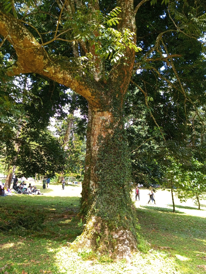 The image displays an outdoor environment in Serchhip, India, centered around a large tree occupying the right and central foreground. This tree features a thick trunk with rugged bark, substantially covered in green moss and climbing vines. Its robust branches, laden with green foliage, extend overhead, forming a dense canopy. The ground beneath is covered in green grass, exhibiting varying patterns of sunlight and shadow. In the left midground, a group of approximately 8-10 individuals is gathered on the grass, with some appearing to be seated, beneath the shade of another tree. In the right midground, two distinct figures stand on the grass; one person is clad in a red top and dark trousers, positioned with their back partially to the viewer, while the second figure wears a light-colored top and dark trousers. Additional, less distinct figures are visible further in the background among more trees. The scene is illuminated by bright daylight, creating discernible shadows.