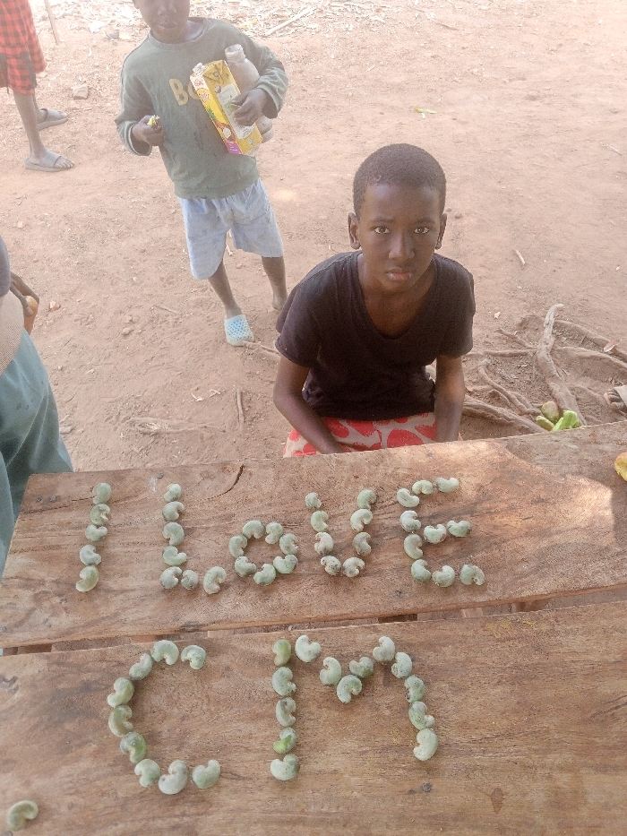 This image, captured in Akwanga, Nigeria, displays an outdoor scene with three individuals and a wooden surface on a dusty, light-brown earthen ground. In the foreground, a young Black male, appearing pre-teen, is seated behind a rustic wooden table. He wears a black t-shirt and a red and white patterned garment around his lower body, looking directly at the camera with a neutral expression. On the wooden surface, green, unroasted cashew nuts are meticulously arranged to spell the phrase "I LOVE CM". Behind the table, another young Black male stands, wearing an olive-green long-sleeved shirt and light blue shorts, holding a yellow carton and a translucent plastic bottle in his left hand. To the far left, the lower leg and foot of a third individual, clad in green trousers and a sandal, are partially visible. Exposed tree roots are visible on the ground behind the seated boy.