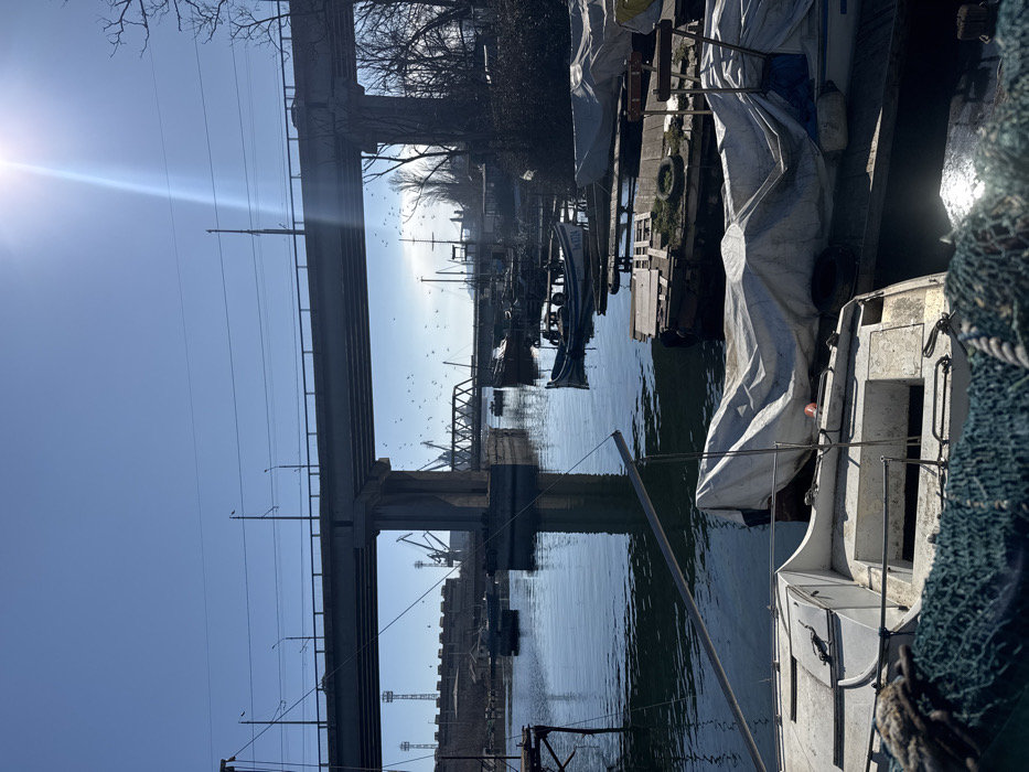 The image depicts an urban waterfront scene in Varna, Bulgaria, specifically within the Varna Lake/Canal area, characterized by a blend of maritime activity and industrial infrastructure. In the immediate foreground, dark blue-green fishing nets are partially draped, obscuring the bottom edge of the frame. Behind these nets, the bow section of a white, open-top vessel is visible, moored in calm, dark blue water. Adjacent to it, a boat covered by a white tarp is docked alongside wooden platforms. Multiple additional small to medium-sized boats are moored throughout the mid-ground, some covered with white tarps, others open, including a blue-striped boat displaying the registration "B 8724" on its stern. A large concrete bridge, supported by robust concrete piers, spans the water centrally, with one main pier prominently reflected in the water. This bridge features overhead utility lines and streetlights along its deck. In the far background, beneath the main bridge structure, a smaller, lattice-girder bridge is visible across another channel. To the left background, industrial port facilities are identifiable, featuring tall lattice-structured cranes and gantry cranes. The right background displays a bank with bare deciduous trees and sparse vegetation. The sky is clear and bright blue, with a strong sunburst and lens flare positioned in the upper right quadrant. No individuals are visible in the scene.