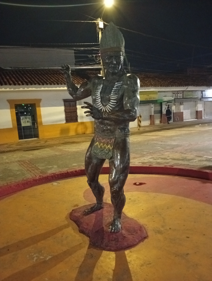 A dark-toned metallic statue of an indigenous male figure stands prominently at night in a public space in Jamundí, Colombia