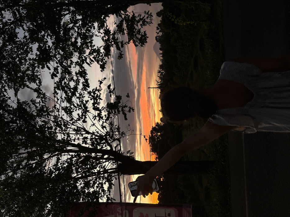 The image captures an outdoor scene at dusk in Gadingrejo, Indonesia. A single individual, depicted from behind and largely in silhouette, stands on a dark asphalt surface in the foreground. This person wears a light-colored, possibly pinstriped, sleeveless garment with a V-neck back and has their hair pulled into a bun. Their right arm is extended vertically upwards, holding a smartphone. The phone's screen displays a bright, reflective white surface with a dark, abstract pattern. The background features a sunset sky transitioning from deep orange and red at the horizon to lighter blue and grey tones overhead, interspersed with clouds. Silhouetted broadleaf trees frame the scene, with dense foliage extending across the mid-ground. Horizontal power lines are visible mid-frame. In the far distance to the right, a distinct conical mountain peak is silhouetted against the vibrant sky. On the far left, a portion of a sign or billboard with red and white elements is partially visible.