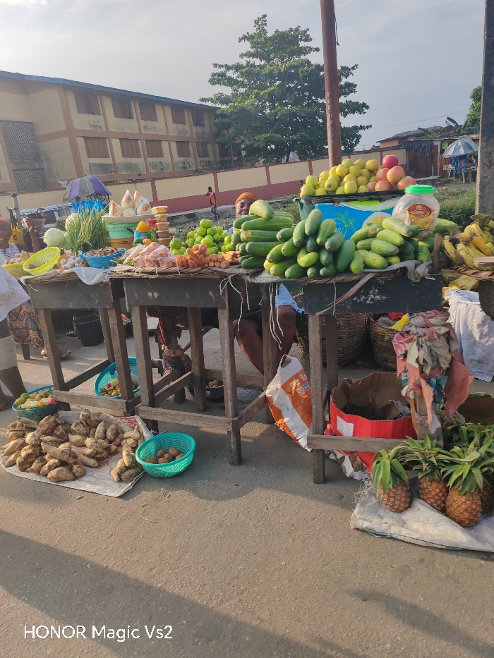 The image displays an outdoor produce market scene located in the city of Str, Nigeria