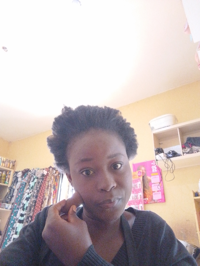 This image depicts a close-up, slightly high-angle view of a single adult female in an indoor commercial setting located in Unknown, Unknown. The female, centered in the frame, has dark skin and short, dark, curly hair. She is wearing a dark, long-sleeved top, possibly a sweater, with a ribbed cuff visible on her right wrist. Her right hand is raised, with fingers gently touching her right cheek and jawline. She maintains direct eye contact with the camera, exhibiting a neutral expression. The background reveals yellow-painted walls and a bright white ceiling. To the left of the subject, a light-colored shelving unit holds numerous small, labeled bottles or containers. Behind this unit, a clothing rack displays various pieces of patterned fabric or garments. To the right, another light-colored shelving unit is visible. The top shelf contains a white, rectangular object. A lower shelf holds miscellaneous items including dark cables and what appears to be a dark electronic device. Below this shelf, a pink poster or calendar featuring images of people is affixed to the wall. The overall environment suggests a small retail shop or boutique.