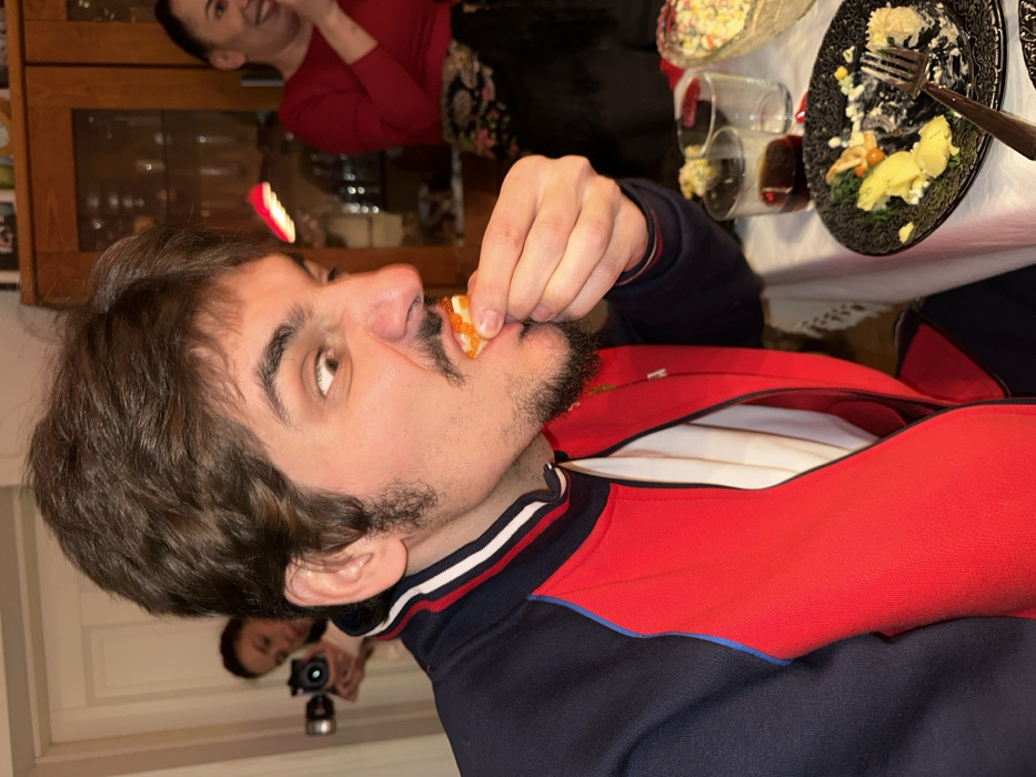 A man is shown in profile, eating caviar on bread. He has dark hair and a beard, and wears a blue and red jacket. Behind him is a table laden with food and drinks, including a bowl of salad and a plate with remnants of a meal. A woman in a red top is visible behind him, and a person with a camera is reflected in a shiny surface.