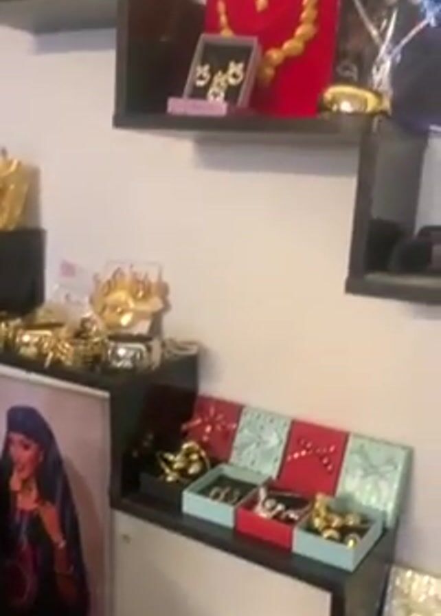 interior of a small retail store. On the walls are shelves displaying jewelry such as necklaces, earrings, bracelets, and rings, some of which are in decorative boxes. A framed portrait is also visible. A display case holds sunglasses and more jewelry. Another shelf features a variety of t-shirts in colors such as pink, green, and orange, as well as stacks of folded clothing. A black sweater with a Mickey Mouse design hangs near a light purple curtain. A red chair and a white table are also visible in the store.