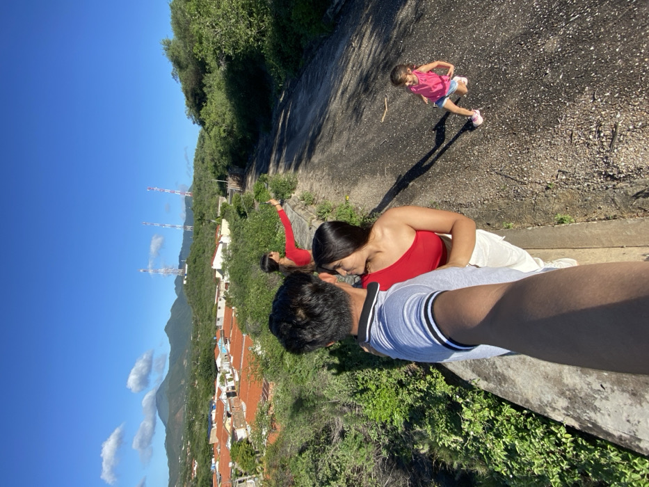 An outdoor snapshot captures a family on a sun-drenched day. A couple poses for a selfie, the woman in a red top and the man in a gray shirt. A young girl in pink runs in the background, her shadow stretching across the pavement. The scene is set against a backdrop of greenery, a village with red rooftops, and a clear blue sky dotted with white clouds. Towering metal structures punctuate the horizon.