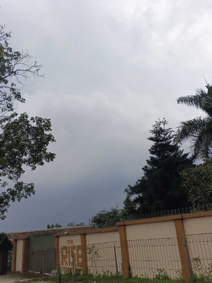 The image displays an exterior scene in Vang Vieng, Laos, under an overcast sky. The upper two-thirds of the frame is dominated by uniform grey clouds, indicating dense cloud cover. A substantial perimeter wall, constructed from light beige panels with prominent orange-brown vertical pillars and coping, extends horizontally across the lower middle. The top of this wall is fitted with anti-climb spikes. A segment of the wall on the left side is painted an olive-green hue. Large, gold-colored lettering on the beige wall section reads "THE RICE," with a second word, likely "RESORT," partially visible beneath, identifying the property as The Rice Resort. In the foreground, a dark metal wire fence runs parallel to the wall, with sparse green ground vegetation growing along its base. To the far left, a small structure with a dark roof and an open side is partially visible. Various trees are present: a deciduous tree with green foliage and bare branches occupies the upper left, while a tall, dark green conical evergreen tree stands prominently on the right, accompanied by the fronds of a palm tree. Additional dense green foliage is visible above and behind sections of the wall. No individuals, explicit actions, or interactions are depicted in the scene.