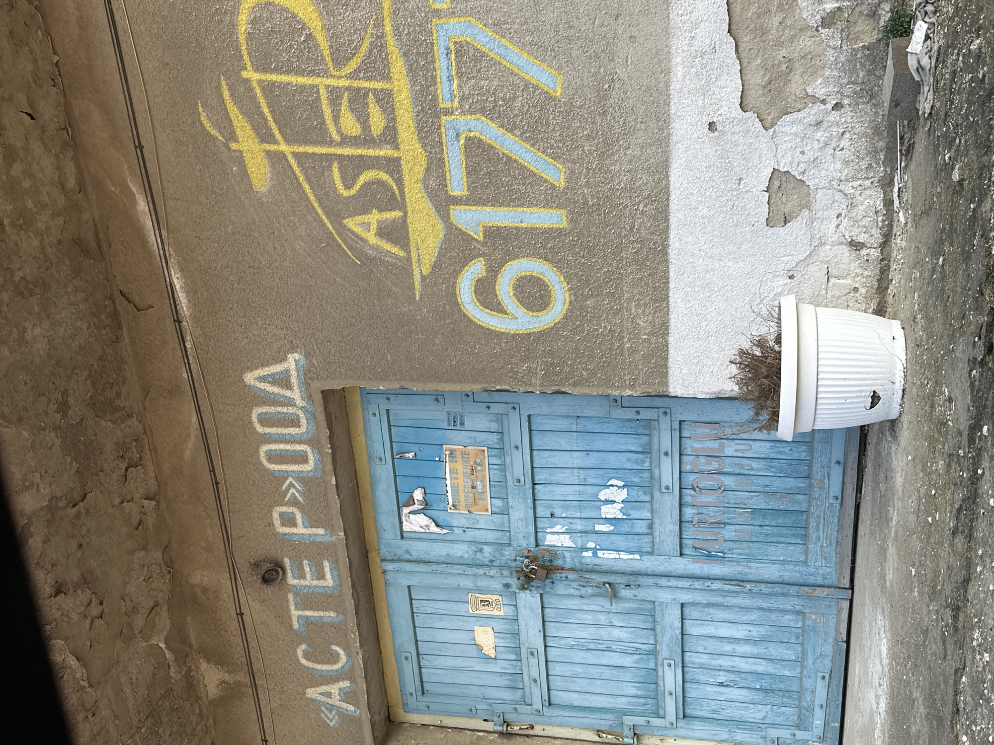 An exterior forensic view captures a section of a weathered building facade in Targovishte, Bulgaria, under ambient daylight. The scene is dominated by a pair of dilapidated, light blue double wooden doors, secured by a single rusted padlock and featuring a dark, worn handle on the right door. Faded white and grey lettering on the doors reads "KURIOĞLU" and "ALUMINIU." Multiple torn and creased papers and posters are affixed to the doors, including a small emblem with the number "30" on the left door and a larger, faded rectangular sign on the right door displaying partially legible Cyrillic text, "ОБЩЕТЕ ИМ ОПРЕДЕЛЕНИТЕ МЕСТА" (notify them of the designated places). The building wall, composed of stucco or similar material, exhibits extensive wear, including peeling paint, exposed underlying plaster, and cracks. A white horizontal painted band marks the lower section of the wall to the right of the doors. Above the doors, painted directly onto the wall in blue outline with white fill, are the Cyrillic characters "АСТЕРООД" (ASTEROOD). To the right of the doors, yellow stylized graffiti forming the letters "ASER" is visible, with an abstract yellow graphic above it. Below this, the numbers "6177" are painted in light blue with a yellow outline. Two horizontal electrical wires are secured to the upper wall, with a small, circular, dark-colored device mounted between them, slightly to the left of the "АСТЕРООД" text. At the base of the right door, a white, ribbed plastic planter with a jagged hole near its bottom contains dry, brown plant material. The ground directly in front of the doors and planter is a patchy concrete surface, appearing uneven, soiled, and potentially damp in areas. No individuals or active movements are observed.