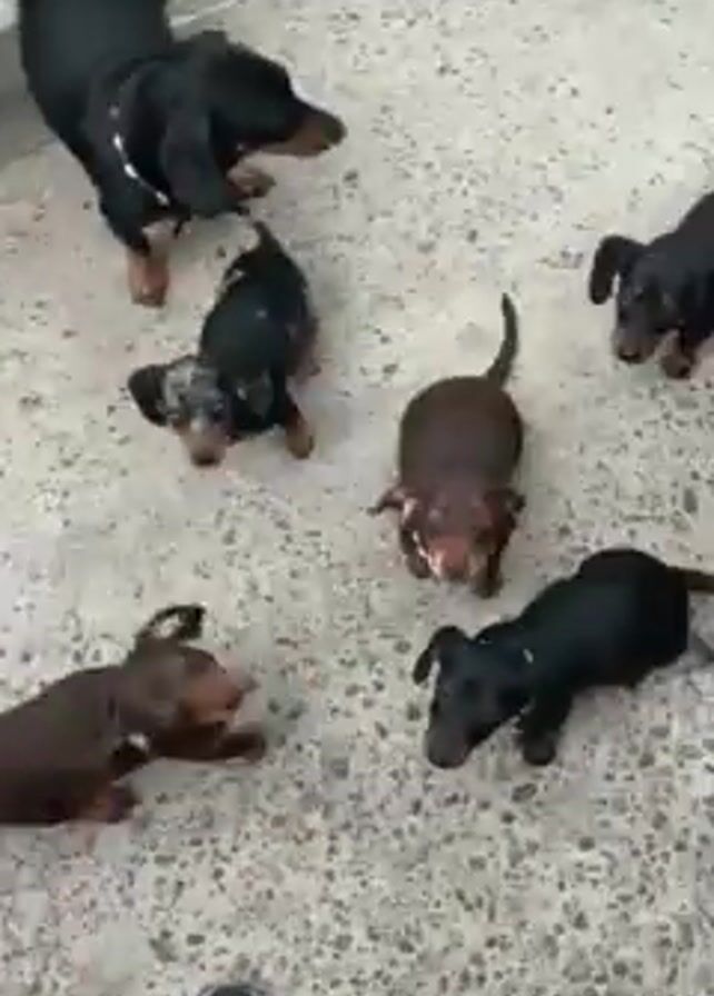 A hand holds a blue plastic dog bowl with six outer compartments containing brown kibble and pieces of broccoli, and a central compartment with a few kibble pieces. A group of dachshund puppies, mostly black and brown, with one dapple-colored dog, gather around. The bowl is placed on the ground, and the puppies eagerly begin eating from the compartments. The setting appears to be an outdoor concrete surface.