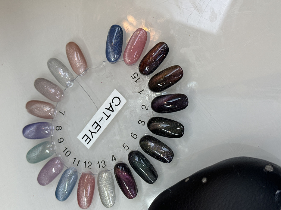 The image displays a close-up, overhead view of a circular, clear plastic nail polish display wheel, positioned on a light-colored, possibly off-white, surface within an interior setting in Tunbridge Wells, United Kingdom. The wheel features fifteen oval-shaped artificial nails arranged radially, each painted with a unique 'cat eye' effect nail polish. The colors vary, including iridescent shades of blue, pink, silver, purple, green, dark maroon, and brown, all exhibiting a distinct shimmering light band. The wheel's periphery is marked with numbers 1 through 15, though not all are fully visible. A white rectangular label centrally affixed to the wheel reads "CAT-EYE" in black uppercase lettering. A dark, possibly black, textured object, appearing to be a chair armrest or cushion with several light-colored wear spots, is partially visible in the lower-left quadrant of the frame. No individuals or specific actions are depicted.