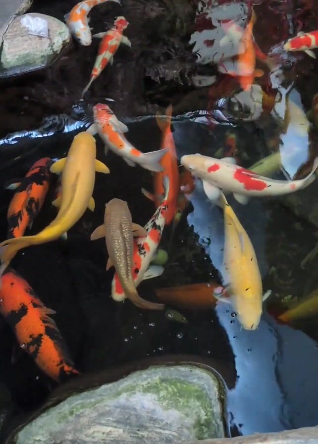 The camera pans up from a view of a pond filled with various koi fish in orange, white and red, yellow, and tan