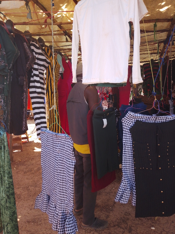 A man wearing a gray vest stands amidst a clothing rack. Various garments hang around him, including a white long-sleeved shirt, a black and white striped garment, a red dress, and a black dress with gold studs. Additional clothes such as a green dress and a skirt with a black and white pattern are visible. The setup suggests an outdoor market or clothing stall, possibly under a makeshift shelter or awning.