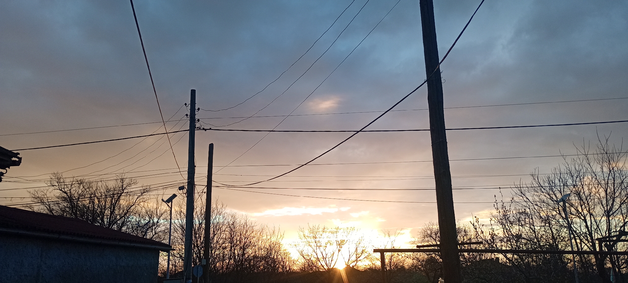 sunset in Alfatar, Bulgaria. Silhouetted against the sky are trees, power lines, and utility poles. A building with a red roof is visible in the lower left corner of the image. The sky transitions from blue-grey to orange towards the horizon where the sun is setting.