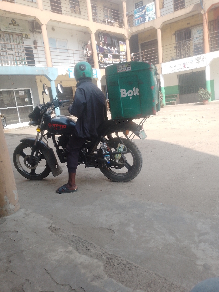 A single individual is depicted from behind, seated stationary on a black "Gamma Mobility" motorcycle. The person wears a green full-face helmet, a dark long-sleeved shirt, dark three-quarter length trousers, and dark flip-flops, with their left foot resting on cracked concrete paving. The motorcycle is equipped with a large, square, dark green delivery box affixed to the rear rack, featuring the word "Bolt" in white capital letters. Two plastic bottles, one identifiable as Fanta, are secured to the motorcycle's frame near the rear wheel. The setting is an outdoor area in the city of Unknown, Unknown. Behind the motorcycle, a multi-story, light-colored (beige/cream) commercial building with multiple balconies and dark railings occupies the background. Its ground floor houses various establishments, including one with large windows and another displaying clothing on mannequins. A "VENTINO PRINTING" sign is visible on an upper floor. The ground transitions from cracked concrete in the foreground to a dirt or gravel surface beyond the motorcycle. A small potted plant is visible near a building section with green and white striped walls on the right side of the frame. The scene is brightly illuminated, casting shadows.