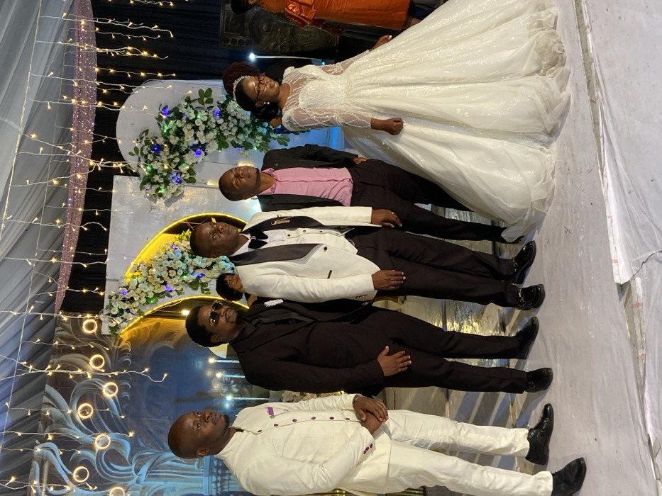 - "The image displays a formal wedding reception scene in Dar es-Salaam, Tanzania, featuring six individuals standing on a temporary white floor covering against a decorative backdrop" by FM-hlmC83, licensed under CC BY 4.0