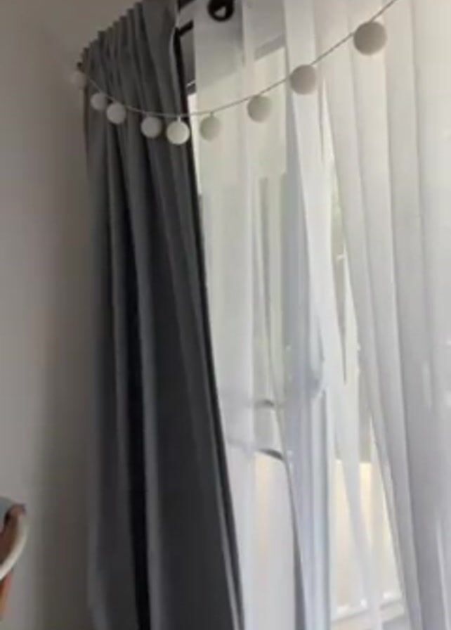 window covered with gray and white curtains. A string of decorative white spherical lights is hung above the window. The window appears to have a frame. The wall is white. A chair is partially visible at the left edge of the frame.