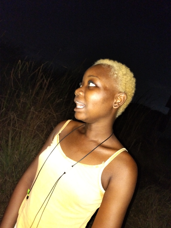 A woman with short, dyed blonde hair stands outdoors at night. She's wearing a yellow tank top and a thin black cord necklace or lanyard. Her mouth is slightly open, and she is looking up and to the left with an expression of surprise. Dark grass and vegetation surround her. The background is almost entirely black, indicating a lack of light. Her skin is dark with a golden undertone, lit by the flash. She has what appears to be tunnels in her earlobes.