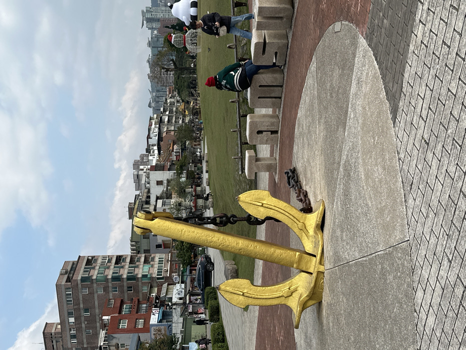 A gold anchor stands prominently on a concrete structure, with a chain visible. Behind it lies a grassy area leading to buildings. People are seen, including some interacting with large, blocky lettering that spells out "TAMSU." The scene is partially sunny with scattered clouds. The anchor is on the right side of the image. The concrete is gray and the brick pavers are a mix of red and gray.